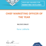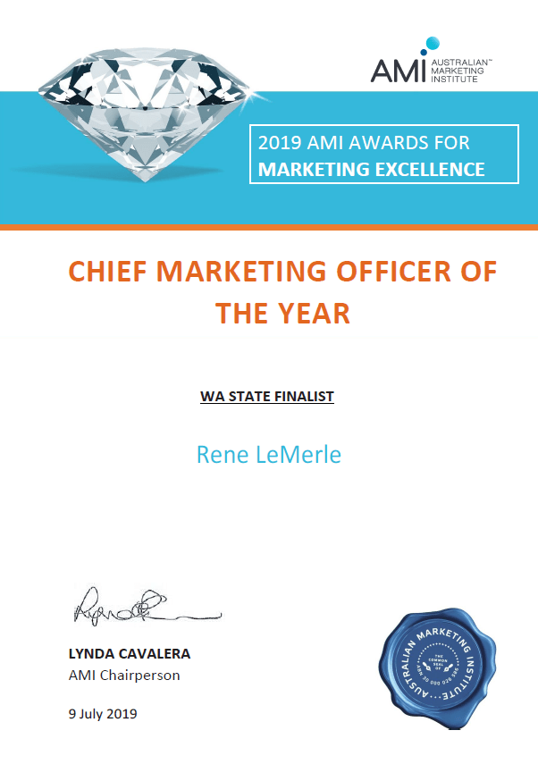 Rene LeMerle, our Head of Marketing, is again up for the national Chief Marketing Officer of the Year title. Rene has already been awarded the state title for the third year in a row.
