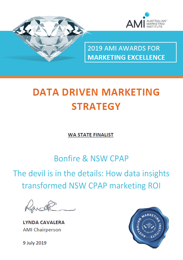 Bonfire is also a state finalist in the Data Driven Marketing Strategy category for our work with NSW CPAP. Our entry, ‘The devil is in the details: How data insights transformed NSW CPAP marketing ROI’, is competing against Carat’s campaign with Cash Converters. Bonfire was previously awarded the title in 2017 for our work with CV Check.